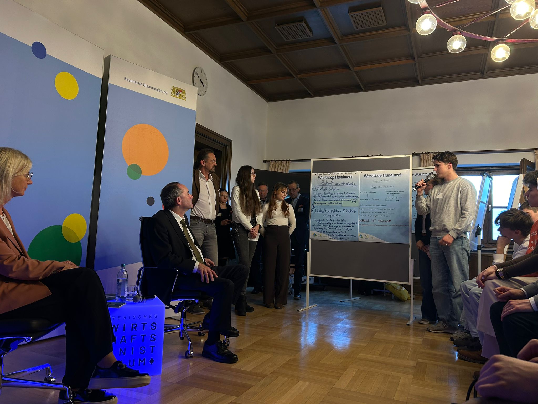 Wir waren am 20. November bei den Jugendpolitiktagen im Wirtschaftsministerium in München. Dort hatten wir die Gelegenheit, mit Wirtschaftsminister Hubert Aiwanger und Jugendministerin Ulrike Scharf über Ideen zu sprechen, wie Ausbildungsberufe und das Handwerk für Jugendliche attraktiver gestaltet werden können.